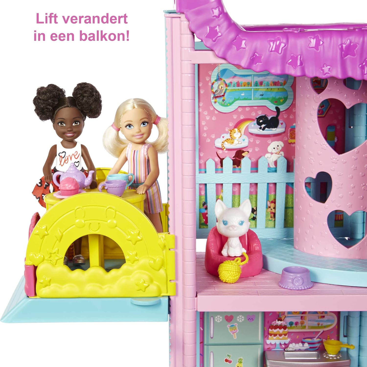 Barbie poppenhuis, Chelsea speelhuis met 2 Huisdieren, Meubels en Accessoires, Lift, Zwembad, Glijbaan, Ballenbak en Meer, HHX44