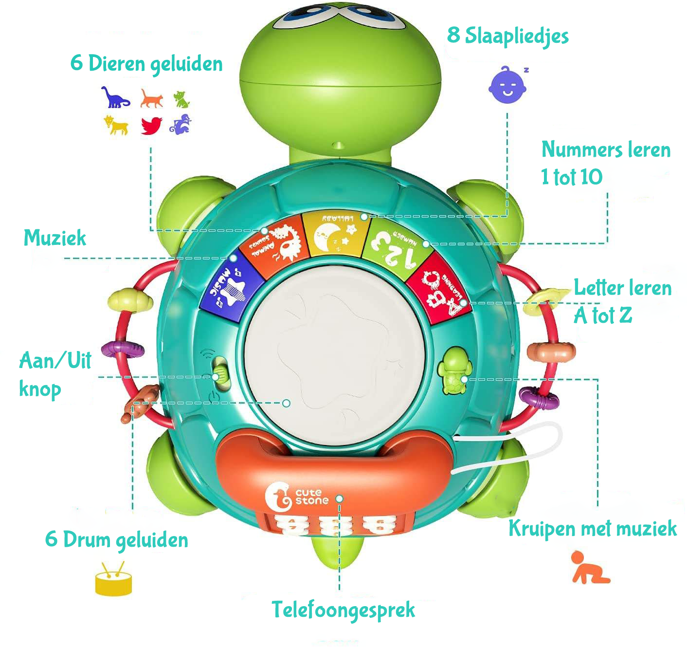 Opties: Verken vier spelmodi, leer vrolijke liedjes, schattige patronen, tellen en ABC-letters. De schildpad kruipt mee met vrolijk gezang.